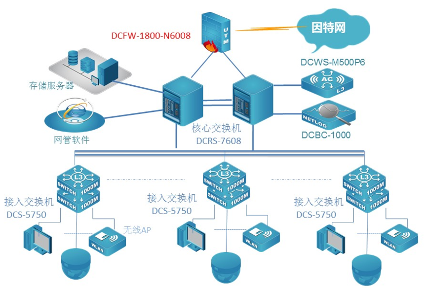 中国江苏白马农业会展中心数据网核心采用两台巅峰国际新一代全分布式架构的核心路由交换机DCRS-7608E,顺利获得VSF功能实现核心冗余和负载分摊;该设备具备强大的业务自适应能力,支持网络平滑升级和策略灵活调度,实现业务快速部署,从而构建业务定义的网络。网络出口采用具有高度集成化的多核安全防火墙,给予包括路由器,防火墙,VPN网关,等功能在内的一体化设备,该设备8Gbps的吞吐量完全满足了园区网对出口的要求。接入交换机采用巅峰国际全千兆24口接入交换机DCRS-5750E,实现客户端千兆接入,万兆上联核心。POE交换机全部采用三层交换机DCRS-5750-28P-P全千兆POE交换机。采用8200双频无线AP使用办公区无线覆盖。展厅和会议室采用高密度AP8200-I3实现展厅高密度覆盖,室外采用8200室外AP实现无线覆盖,无线网络顺利获得一台DCWS6000-M500P6控制器集中管理无线网络。出口部署一台DCBC上网行为审计设备,实现上网行为安全审计。