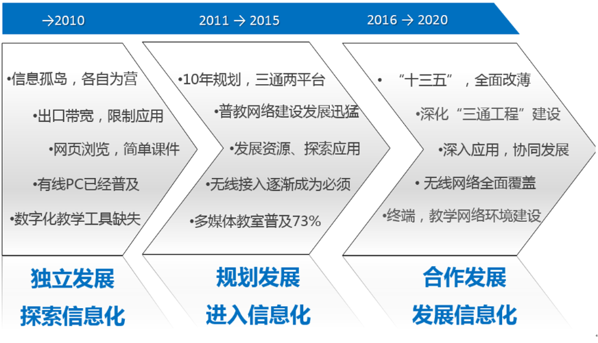 “深入推进“三通工程”:基本实现各级各类学校宽带网络全覆盖与网络教学环境建设,优质数字教育资源服务基本满足信息化教学需求…推进“无线校园”建设: