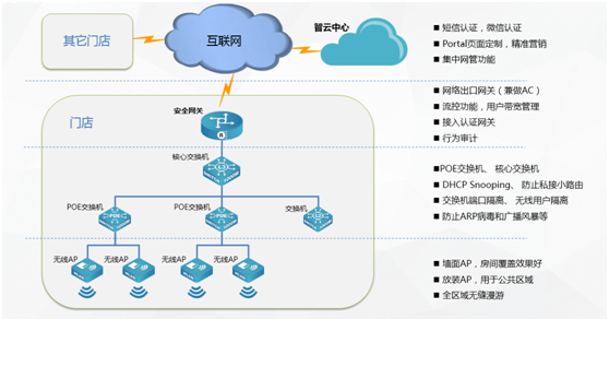 面对移动互联网大潮对传统行业的冲击,运用云计算、移动社交、大数据分析等技术,为酒店、餐饮、休闲娱乐、零售商超等商业市场客户构建基础网络平台,加速商业市场客户业务创新和转型已经刻不容缓,巅峰国际智云商业解决方案志在为商业客户给予最强的用户体验,给予最具商业价值的云网络,给予基于portal认证,短信、微信营销功能。